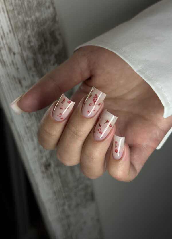 Subtelna, elegancka stylizacja w odcieniu mlecznego nude z delikatnie zatopionymi suszonymi kwiatami (Spring Nude N7). To idealna propozycja dla klientek, które kochają minimalistyczny look z nutą romantyzmu.