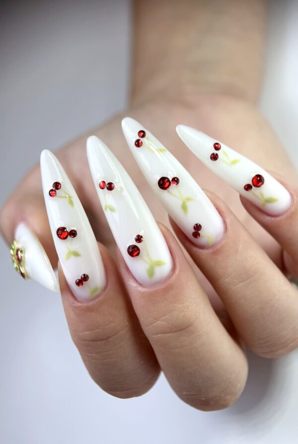 Świeża, nowoczesna stylizacja w mlecznej bieli (Builder Gel №Ivory) na smukłej formie migdała. Subtelne wisienki namalowane cienką linią w połączeniu z czerwonymi akcentami tworzą lekki, dziewczęcy efekt, który idealnie wpisuje się w letnie i wiosenne trendy.