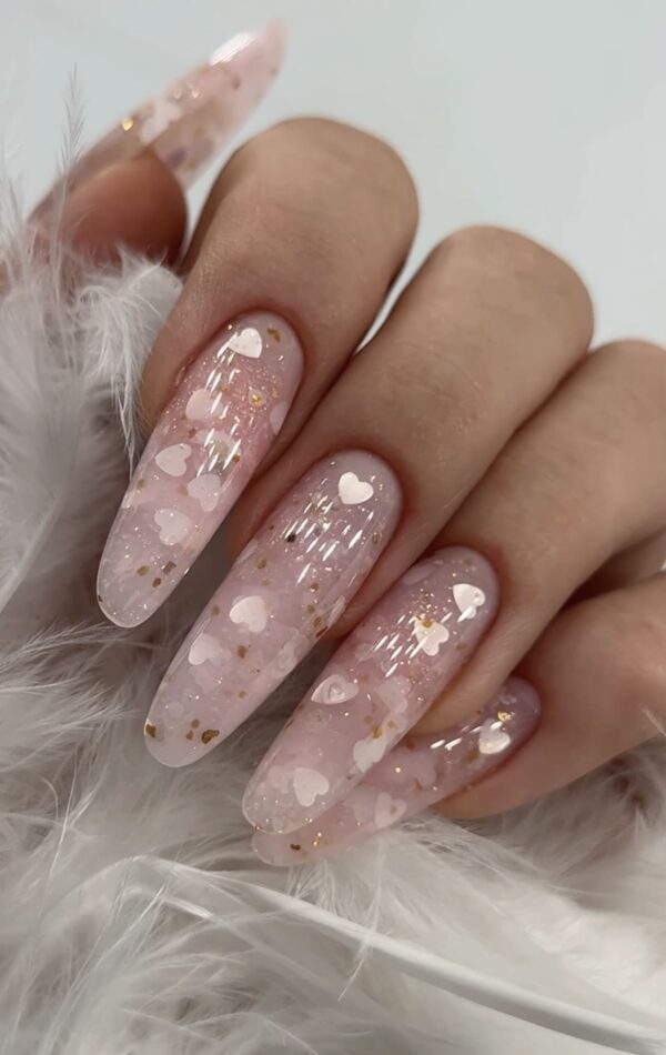 Delikatna stylizacja w półtransparentnym odcieniu Kiss, wzbogaconym o subtelne białe serduszka i złote drobinki Builder Gel KISS №2. Całość tworzy lekki, dziewczęcy efekt, który pięknie podkreśla smukłą formę paznokci. Transparentny żel dodaje stylizacji świeżości i lekkości, a zatopione elementy budują miękki, romantyczny klimat — idealna stylizacja na Walentynki