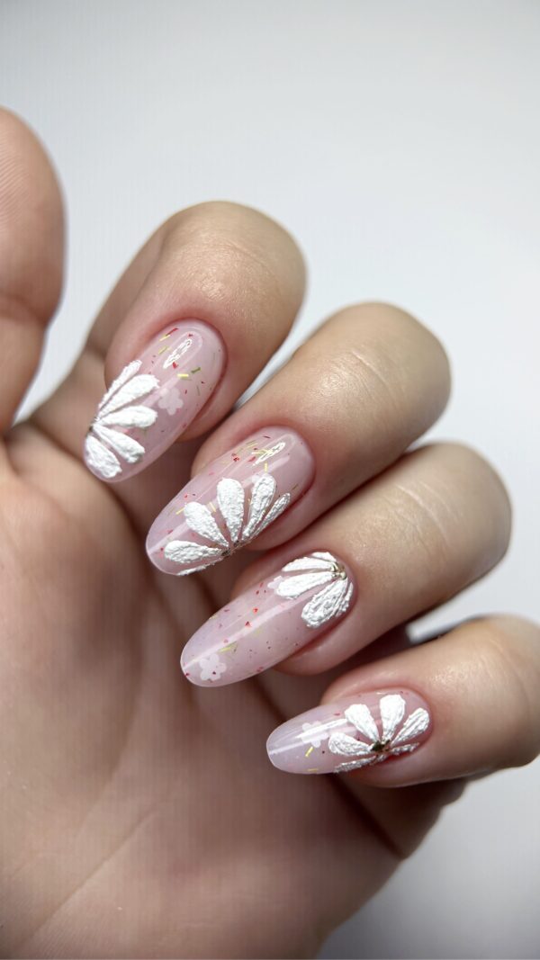 Delikatna, świeża stylizacja w odcieniu półtransparentnego różowego nude z subtelnymi drobinkami zatopionymi w Builder Gel Flower №4, które dodają paznokciom lekkości i blasku. Ozdobiona ręcznie malowanymi białymi kwiatami 3D. To manicure, który idealnie wpisuje się w wiosenny sezon – kobiecy, elegancki i bardzo „clean”.